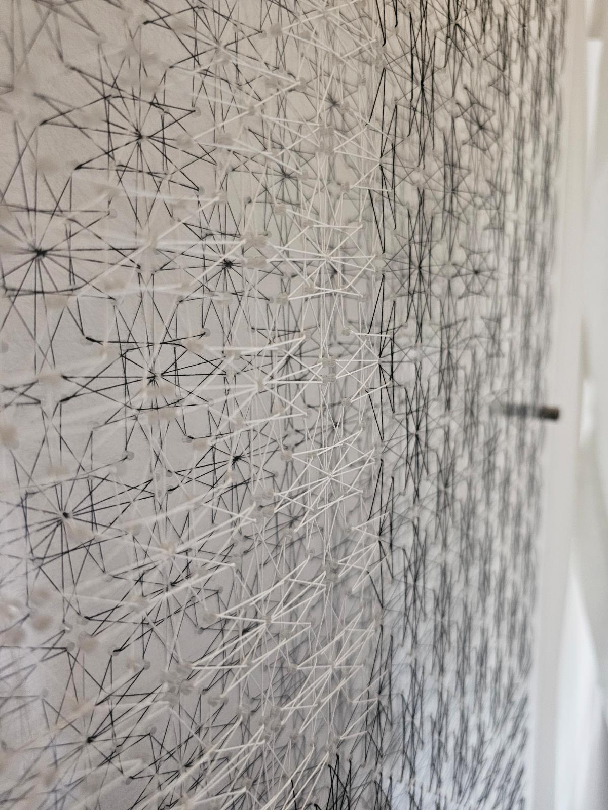 Interior object, combining hand embroidery and CNC technology, is inspired by glass concrete blocks that produce optical illusions. Transparent wall ornaments preserve openness, and doubled motifs enhance harmony. Drawing from Czech architect Pavel Janák's cubist principles of prisms and pyramids, the design utilizes crystal-like translucence to create shifting perspectives. Embroidery transcends decoration, transforming into geometric abstraction and structure.