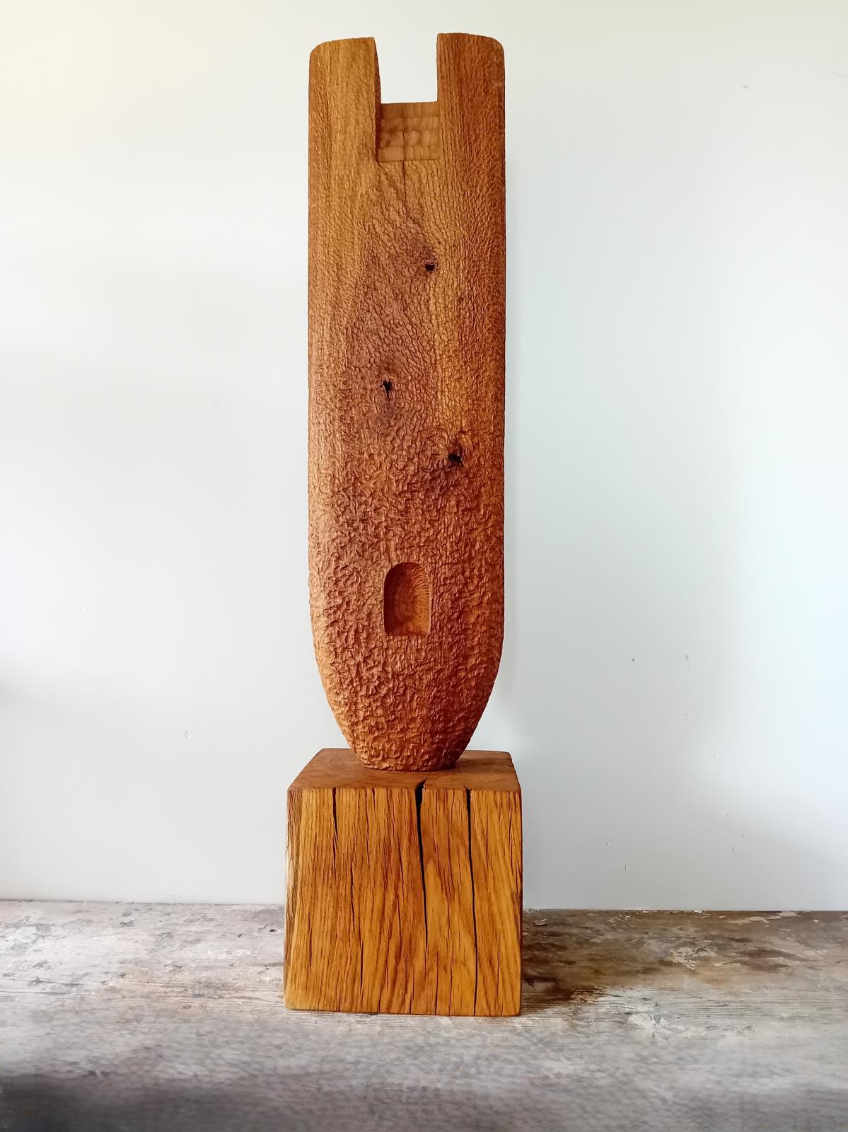This sculpture is part of a series entitled ‘Monolith’, where I am drawn to my local area of Pembrokeshire with its wealth of castles and ruins; steep steps, archways and rough surfaces of castle walls are all elements in this Welsh Oak sculpture. In 'ASCENT', the steps represent a long journey upwards to the opening at the top –into light from the darkness as a symbol of hope in times of war, and an escape at the end of a long uphill journey through turbulent times. The choppy surfaces illustrate the erosion of the castle walls, as well as describing battles and struggles through the surrounding texture, aggressively textured at the bottom which becomes lighter and smoother as it nears the light at the top.