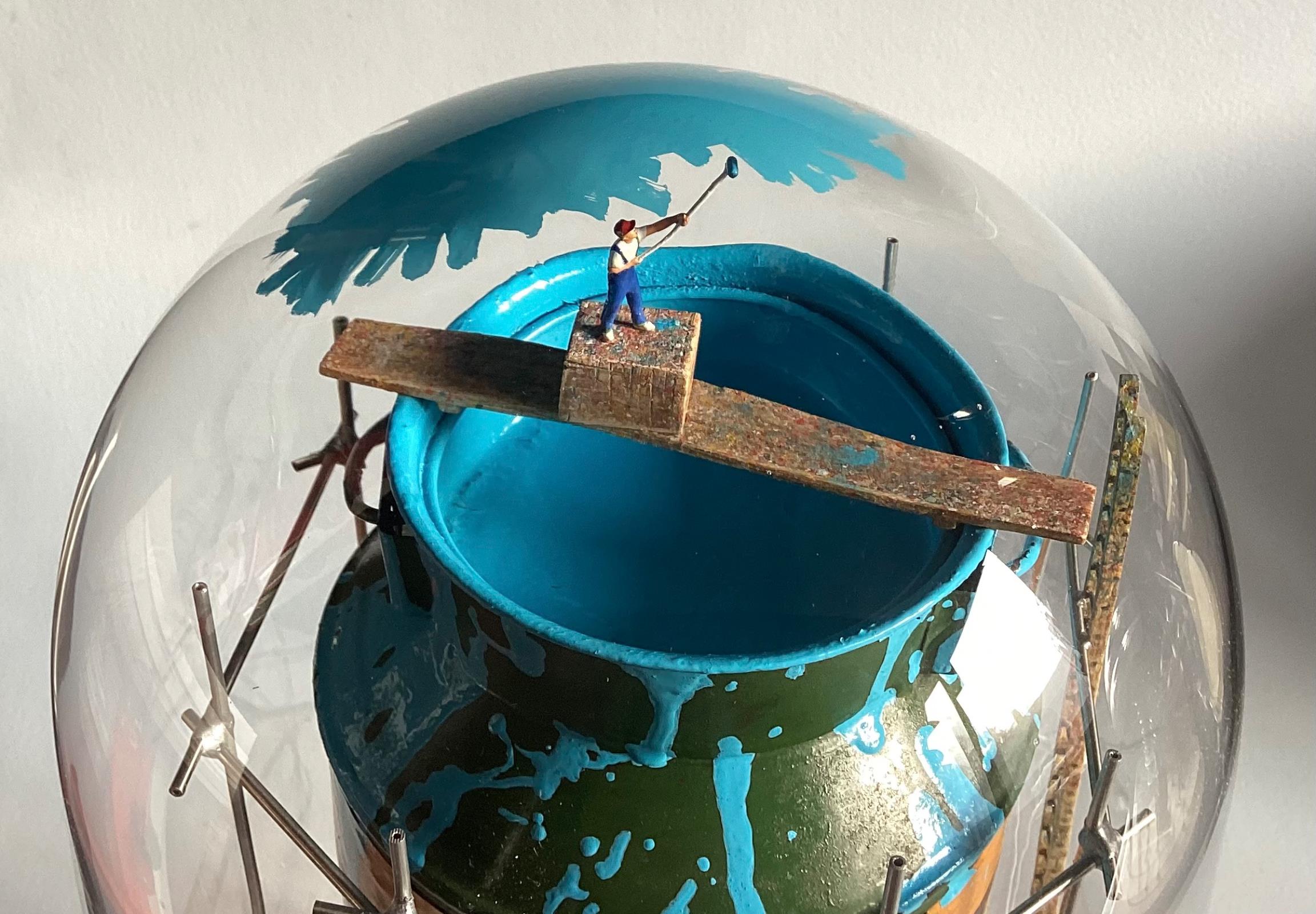 Mixed Media - Repainted vintage paint tin, stainless steel tube, enamel paint, glass dome, Ash base.