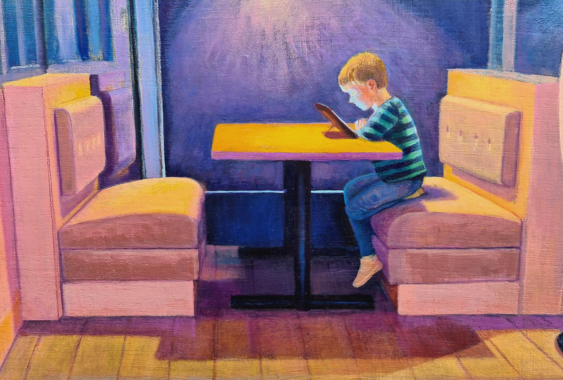 My grandson, enjoying a few moments of calm in the Front Room Theatre after a show. Thin line of sunlight below the blind hints at a bright day outside.