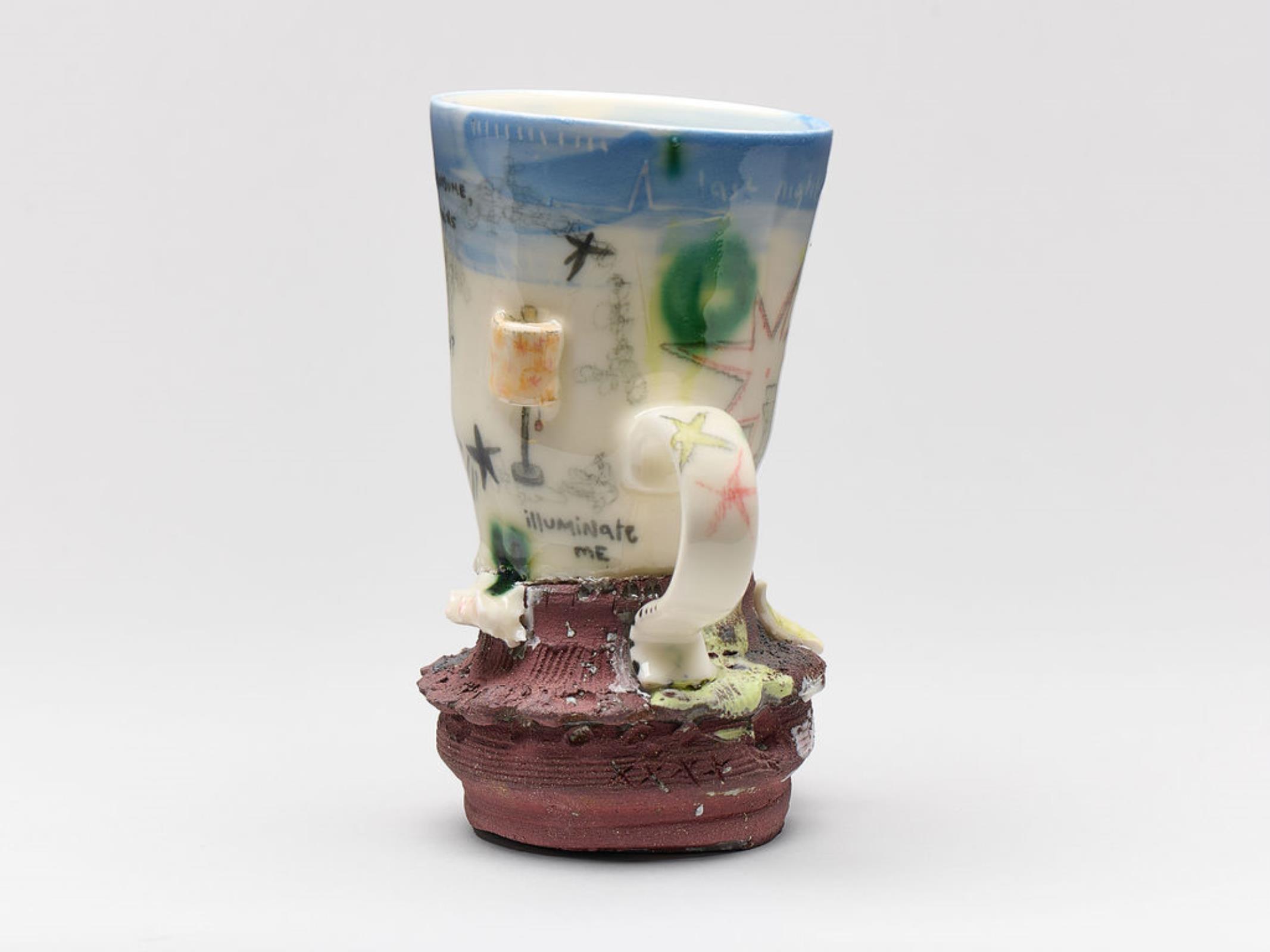 This piece is part of a larger series of ‘muglets’, altered forms each uniquely expressing versions of impermanent introspective observations through the inherent permanence of the ceramic surface. The work begins on the potters’ wheel, using thrown porcelain and red clay to establish a sense of tension and play between the outer and inner experience. The surface is then layered with intuitive uses of slips layered with observations of the everyday and more introspective reflections expressed in a stream-of-consciousness style. This particular piece of work explores the idea of sleep and dreams in a playful and personal manner.