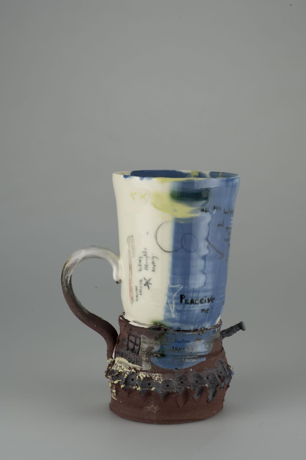 This piece is part of a larger series of ‘muglets’, altered forms each uniquely expressing versions of impermanent introspective observations through the inherent permanence of the ceramic surface. The work begins on the potters’ wheel, using thrown porcelain and red clay to establish a sense of tension and play between the outer and inner experience. The surface is then layered with intuitive uses of slips layered with observations of the everyday and more introspective reflections expressed in a stream-of-consciousness style. This particular piece of work explores the idea of reflection and introspection through the imagery of the routine and everyday.