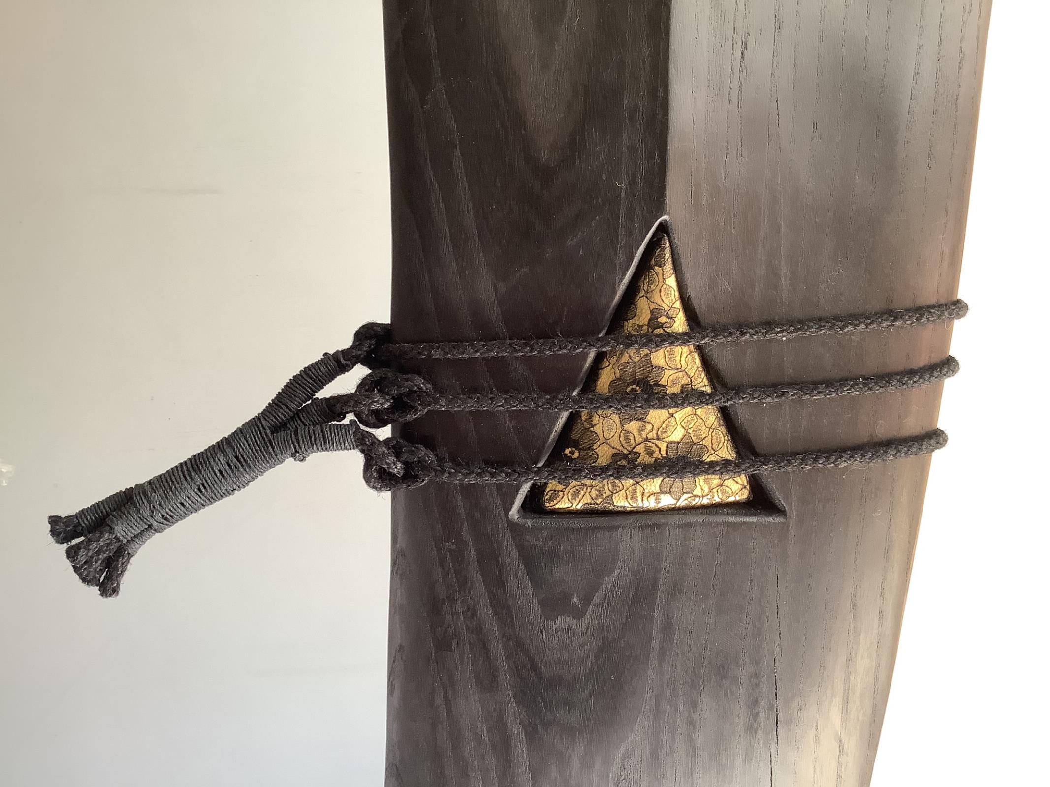 Martyr I pays homage to those innocent human beings suffering in a world marked by displacement, trauma and coercive control. The bent form, blackened wood, nails, and bindings speak of pain, exhaustion and restraint, while the gold leafed triangle veiled in lace represents the inner self - fragile, sacred and preserved even under duress. The title Martyr I conveys both the endurance of suffering and the dignity of survival: a witness to pain yet also to resilience and the unbroken core within.