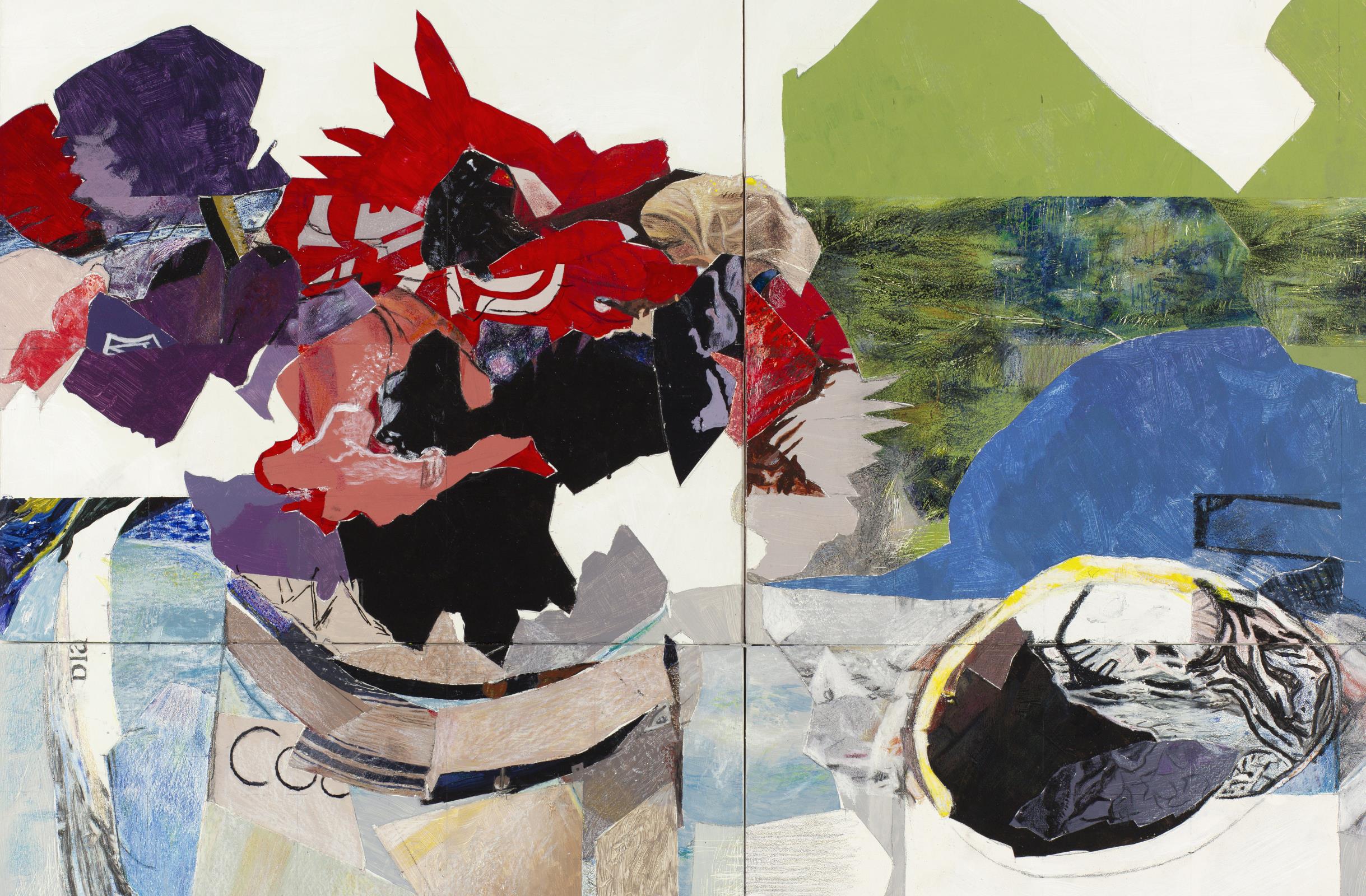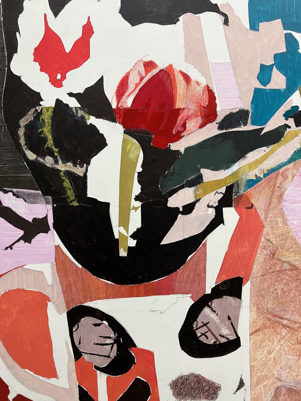 I used sections from some of my small collage still lifes as reference for this painting. I wanted to paint on gesso board as I like the crisp edges that you can achieve with paint on gesso – it has a very graphic quality and is also a resistant surface (which I prefer). I have for some years made collages that are so detailed that they look like paintings and with this picture I wanted to reverse that idea by making a painting that looks, in some areas, like a collage. I particularly relate to the still life work of West Country artists, past and present, who flatten shapes and experiment with textures, colour and the drawn line in a way that combines abstraction with figuration. I wanted to take those ideas further while reflecting my appreciation of West Country still lifes past and present.
