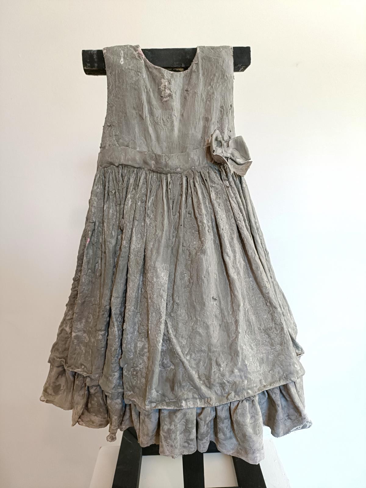 My research connects to trauma and how we can use variations of ourselves to explore past events as a coping mechanism. This led me to using alter egos as a way to create artwork that could test, trial and play with concepts such as space, time, history and reenacting past, troubling events to come to terms with difficult experiences. My PhD research generated three alter egos who, through auto-narrative writing, came to life and started to make artwork that was different from work I would make in my typical art practice. They became a space to imagine and create. They fought, they bickered, and they created fantastical stories and artwork. This piece is part of the generative process. This girl's dress is frozen in time by dipping it in concrete. It transforms it into an antiquity and allows the viewer to interpret it with their own stories and ideas of the life that was led by the little girl who would have worn it. 80cm tall x 45cm W without the plinth. 160cm h with plinth.