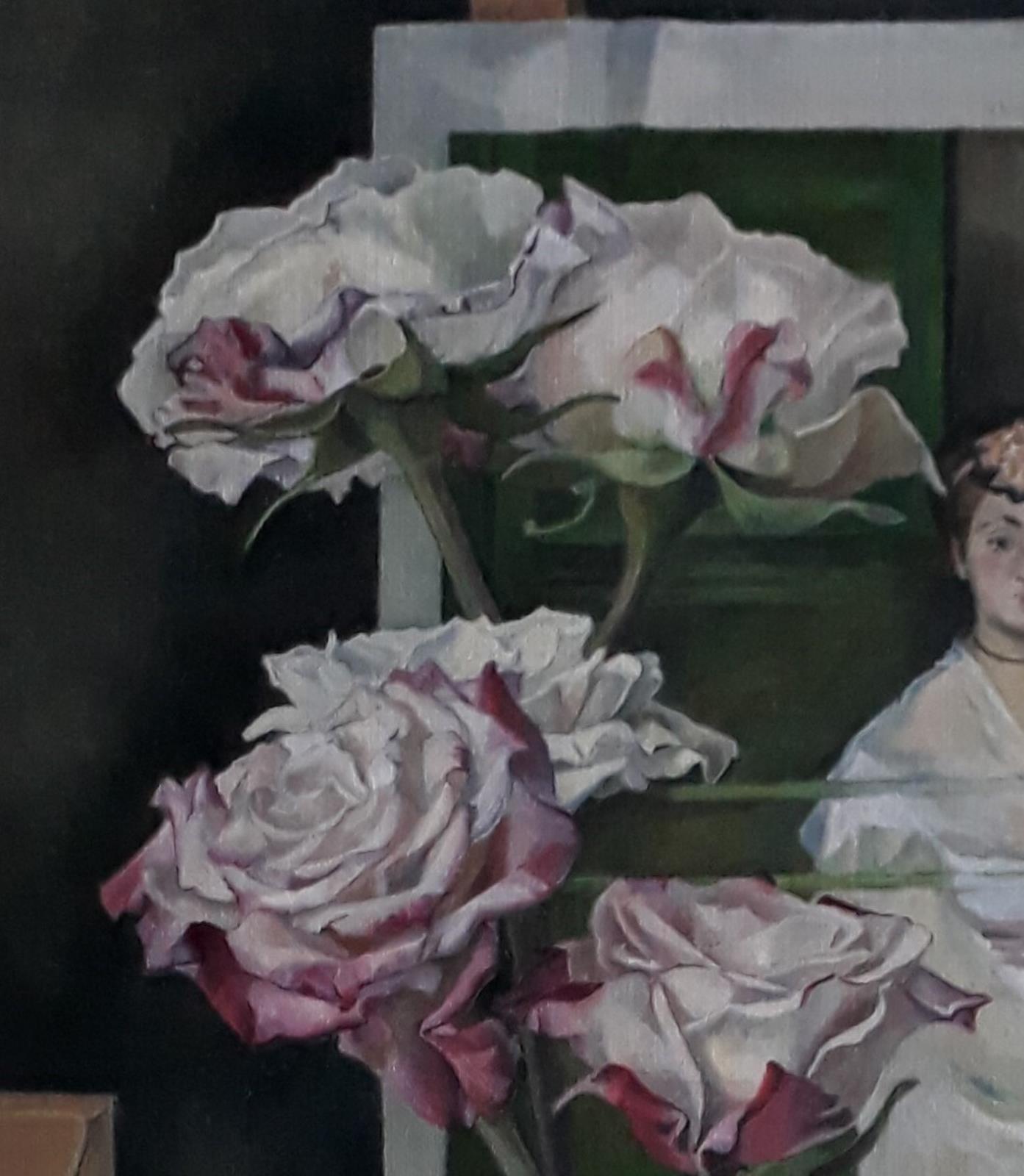 The painting is centred around a print from the Ashmolean in Oxford. The print is of Manet’s preliminary study for his later and larger painting, “The Balcony”. In both he uses the same two female models: Berthe Morisot and the less famous, Jenny Claus, a violinist. In the study it is Jenny who takes centre stage, but later it is Morisot who is seated and all important and ultimately more famous. Consequently, while attracted by the freedom of the study, I also wanted to pay tribute to prim overlooked Jenny. So, with flowers and a new composition, dominated by verticals, horizontals and criss-crossing diagonals, she plays again the main role.