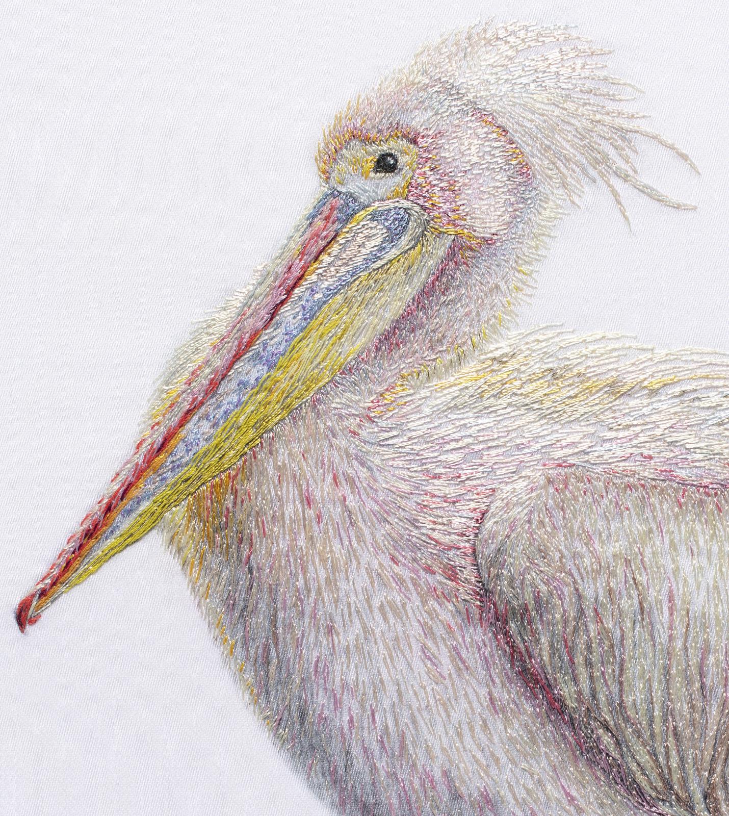 Susannah’s tonal pencil drawing has been digitally printed onto fabric, serving as the foundation for intricate hand embroidery. Using fine machine embroidery threads, she adds colour and textured stitching to enhance the original drawing. This layering of techniques creates a richly detailed surface that blends traditional drawing with contemporary textile art.