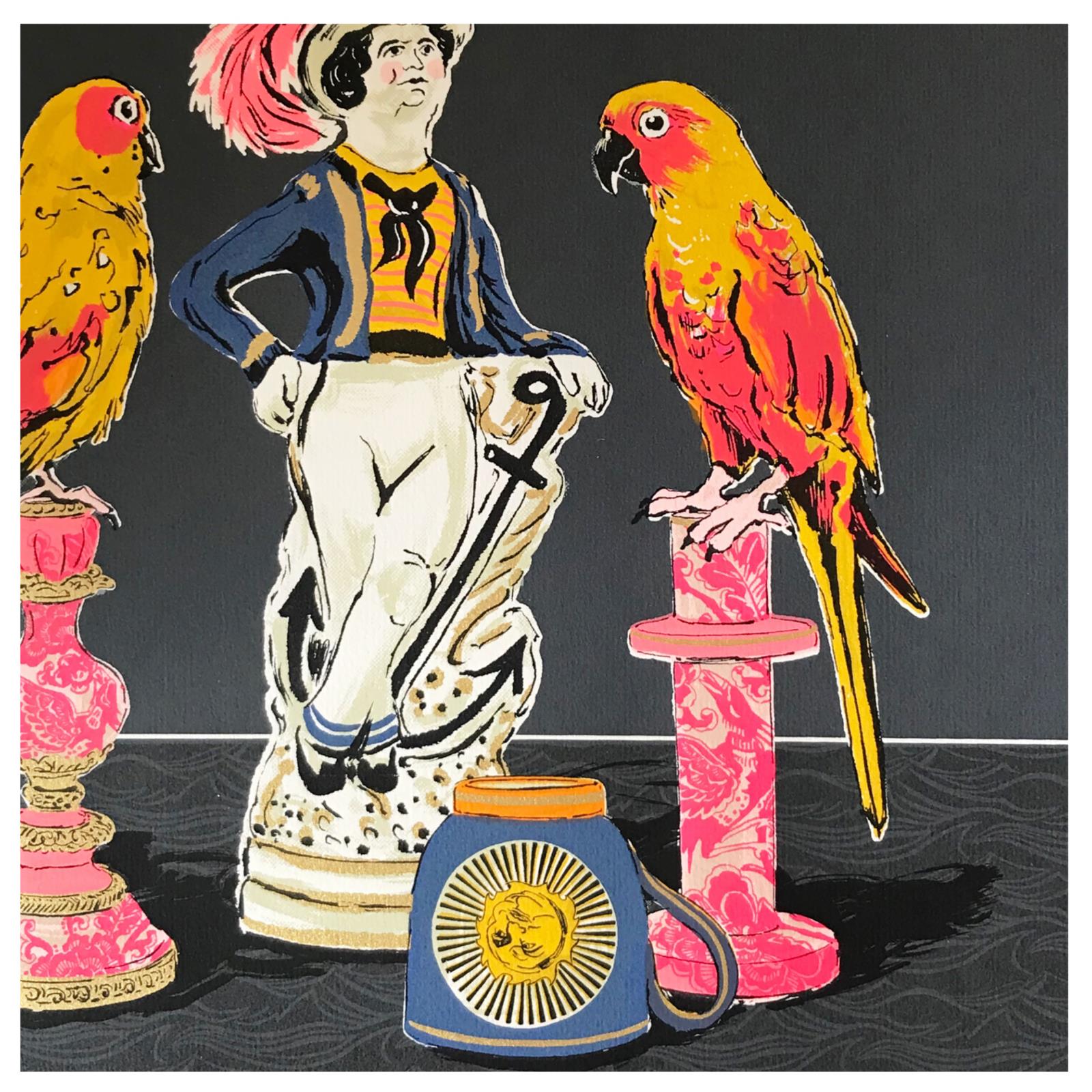 12 colour Limited Edition screenprint on Fabriano paper. A contemporary still life print, with bright pops of colour, based around a Staffordshire figurine of a sailor being admired by parrots. The background is printed in a dark grey with a sea pattern depicting the shelf and some splashes of metallic gold ink.