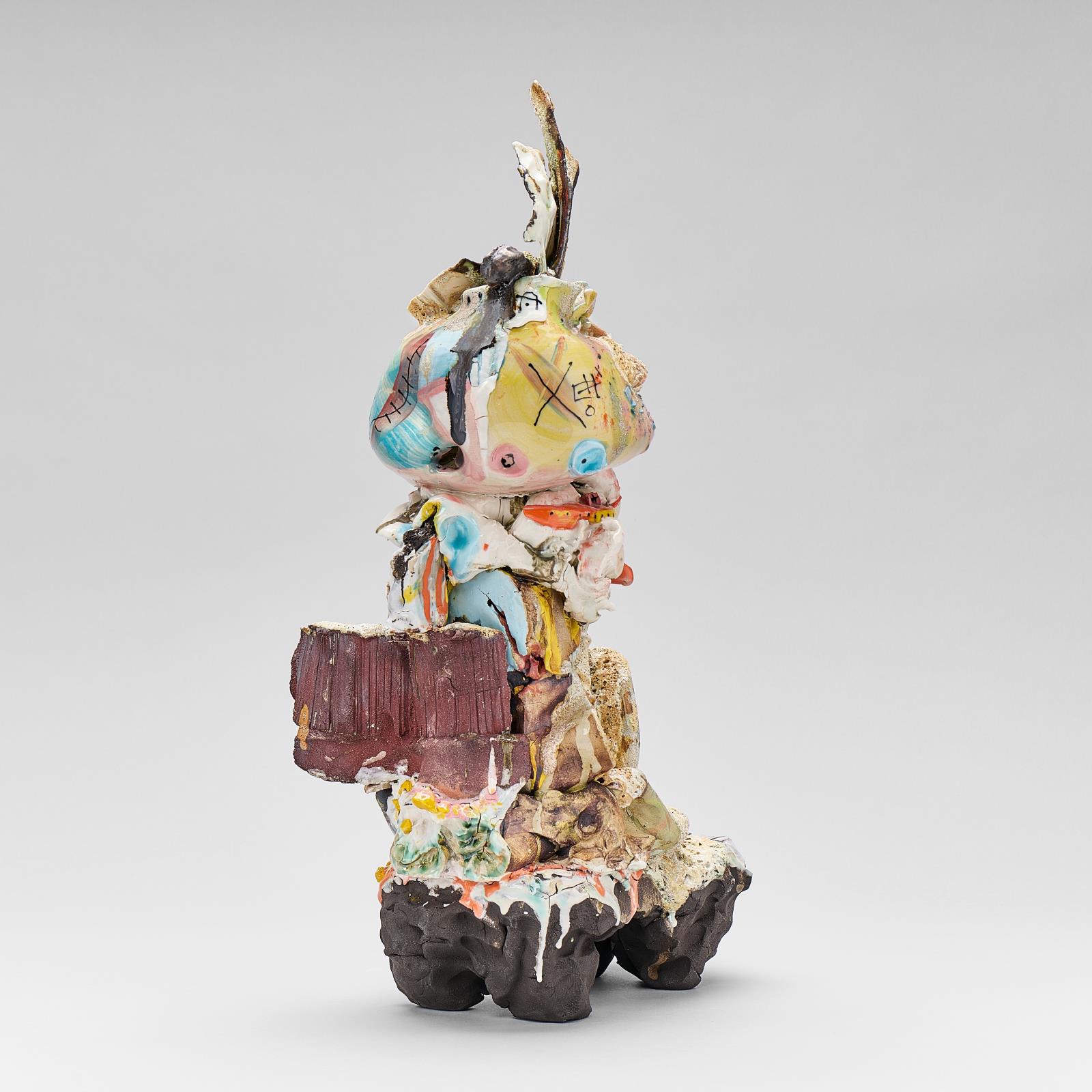 ‘Matrix’ was constructed over several weeks from dropped remnants of wheel throwing demonstrations, and completed with a handbuilt base inspired by graffiti'd remnants of coastal defences. Garish slips were poured and splattered onto the works and dried chunks of coloured clay were flung at the wet surfaces rather than being placed, the idea being to see what sticks rather than directing the end result. Relinquishing control reflects my dialogic relationship with clay and the desire for humanity to shift from a controlling relationship with the earth to a collaborative one. My process takes place at the intersection of intention and intuition, a dialogue between myself and material and between head and heart. I link this with Carl Jung’s term ‘The Transcendent Function’ which expresses the idea something authentic will occur if we can suspend thought, and allow the felt urge to arise from the unconscious.