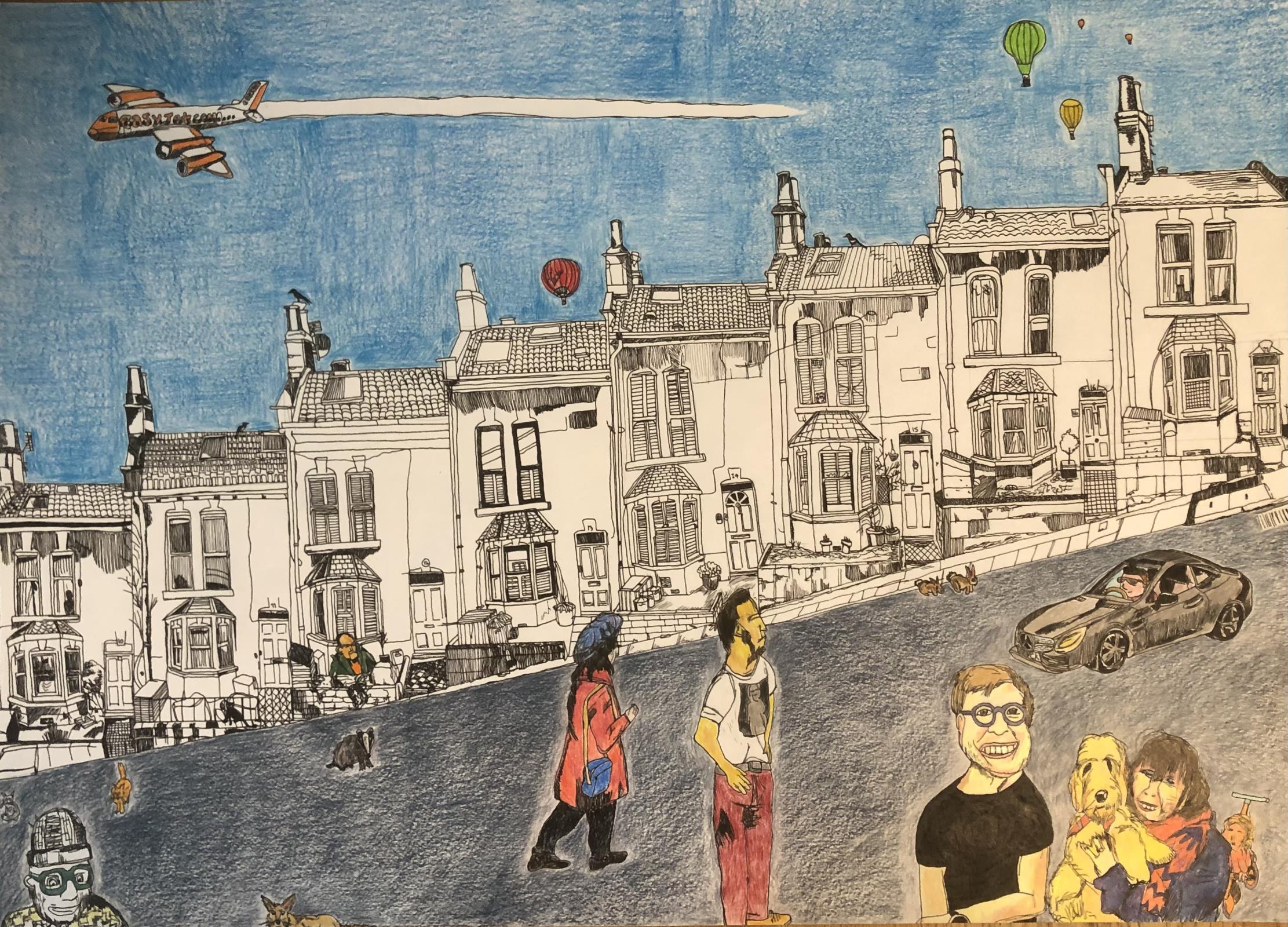 The artwork is of a not so well known street in Bath, Queenwood Avenue, Bath. With some of the neighbours in the middle of the street. Some of the animals and birds that visit the street have been included. The planes fly over head, especially Easy jet and the Balloons on a daily bases sometimes. “Middle of the street” artwork , I did several drawings, photos /of houses in the street and a painting in progress first. Then for the artwork I used measurements and judgements by doing the pencil drawing first. Then carefully I went over the pencil marks in ink pen 0.5. I decided to add colour crayon pencil to the characters, the street, the sky, easy jet and air balloons. The houses I left, as black ink line and white space. So to lead to the imagination of what if. To think mostly about the houses, the slope and the characters in the street. I named the artwork “in the middle of the street “ from the music group Madness. …. The lyrics : Our house “in the middle of the street “.