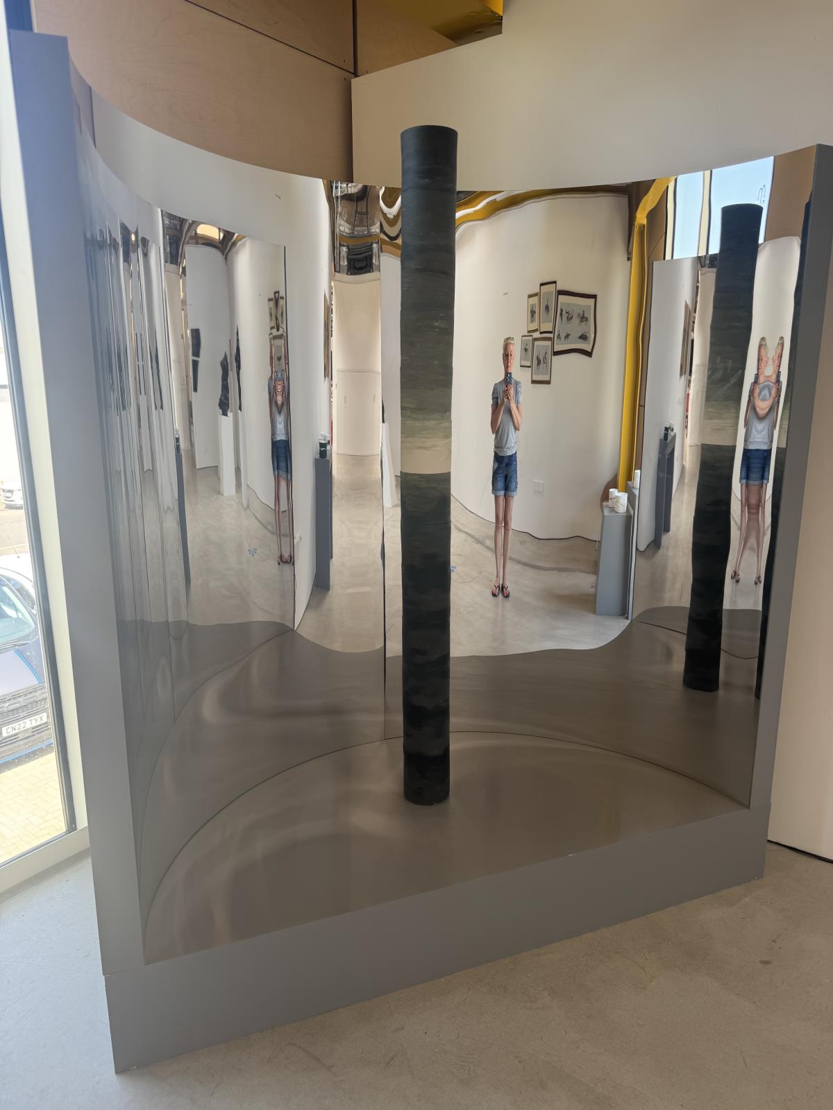 I am a landscape artist specialising in fine bone china slip cast vessels. My interest lies in describing a sense of place through visual stimulation drawing on the emotions that I have when immersed in particular landscapes. This work is made up of a central stacking ceramic column sitting on a plinth. The curve of the set behind is reflective. As the viewer moves around and towards the work the image of the ceramic piece is stretched in the reflective surface and appears as a sea scape behind. This piece is lit from within and light subtly peaks through along the horizon line. My academic research looks at whether artists can affect culture by drawing attention to the environment through landscape art and giving the viewer a moment of positive connection to the natural world. The aim of OPEN SEA is to give the viewer a 'wow' moment but without explanation, this hopefully raises questions. Its experiential & multi sensual. A corner position is preferred & plug needed for LEDs.